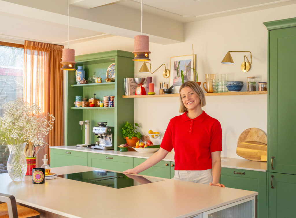 We isoleerden, legden vloerverwarming, plaatsten nieuwe plafonds en een uitbouw. De keuken ontwierpen we in een retro-groene tint met bronzen details en een landelijke uitstraling. Om te voorkomen dat het geheel niet te klassiek of tuttig werd, combineerden we deze met een modern kookeiland, speelse accessoires en een strakke terrazzo vloer.