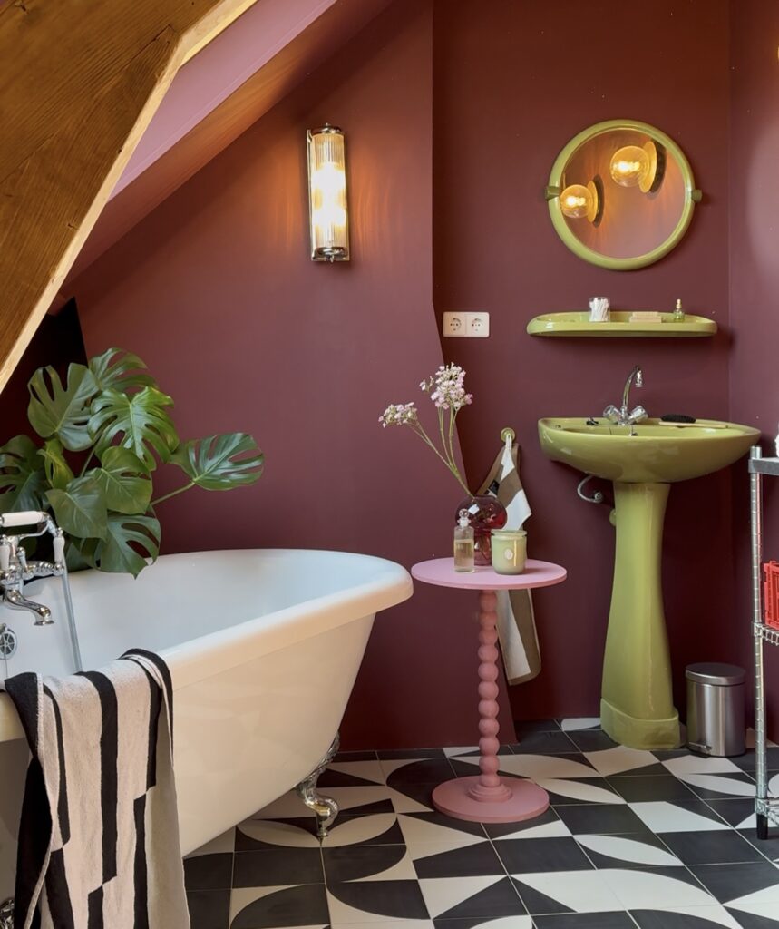 De zolder werd een luxe badkamer en-suite. Hier kozen we voor warme aubergine rode muren, gecombineerd met dieprood, babyroze en geelgroen. Een oude badkuip en retro wasbak – tweedehands op de kop getikt – gaven karakter aan de ruimte.
