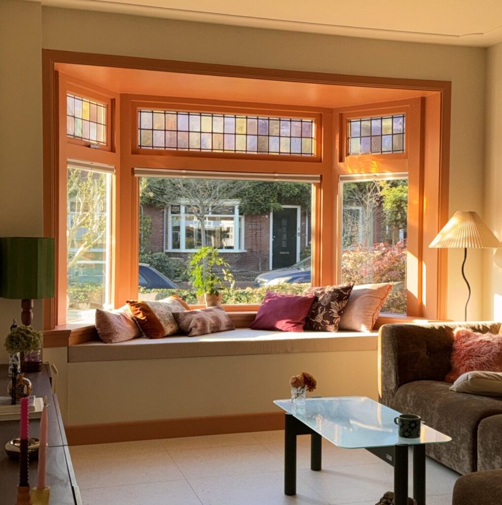 Maar de echte eye-catcher is onze perzik kleurige erker: een warme kleur die perfect combineert met het glas-in-lood.