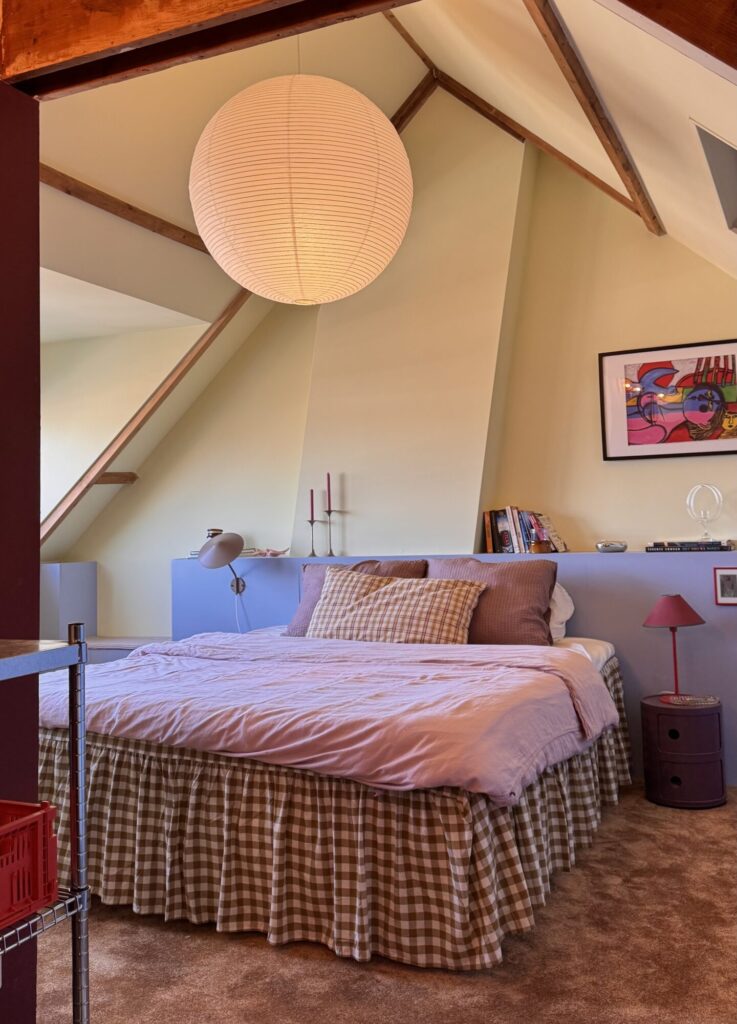 De wanden in de aangrenzende slaapkamer verfden we botergeel en lichtblauw. We combineerden dit met eclectische prints en diep rode accenten die we lieten terugkomen in de raamdecoratie en kussens.